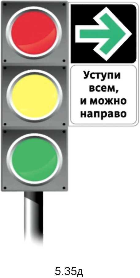 Разрешает поворот направо вне зависимости от сигналов светофора при условии предоставления преимущества другим участникам дорожного движения.