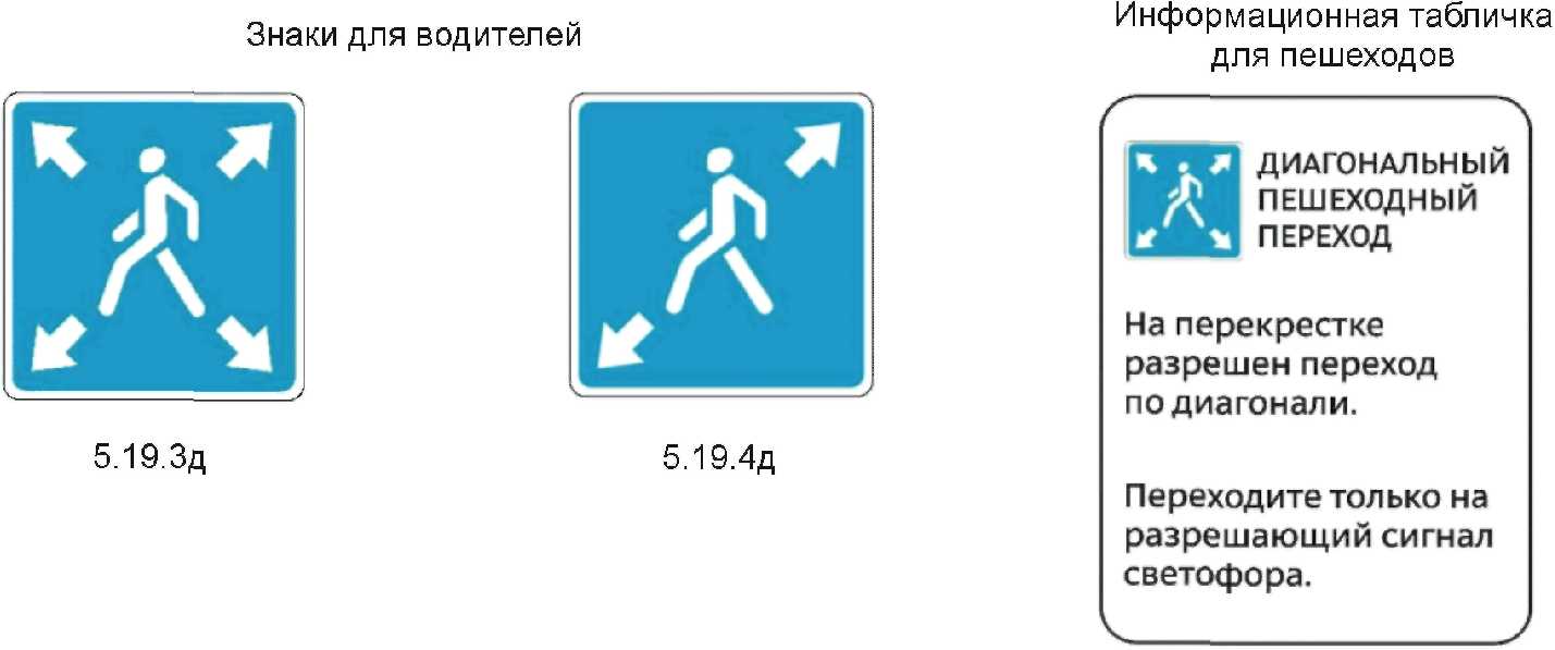 Применяется для обозначения перекрестков, на которых разрешен переход пешеходов по диагонали. Знак 5.19.3д устанавливается перед диагональным пешеходным переходом и заменяет собой знаки 5.19.1д, 5.19.2д. Информационная табличка устанавливается под пешеходной секцией.