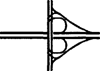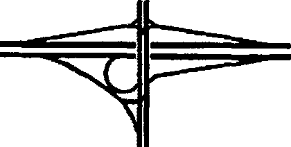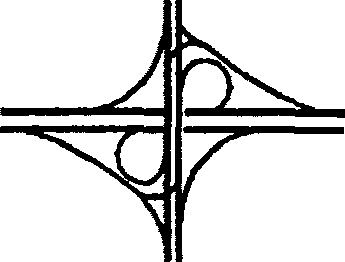 Транспортная развязка с направленными съездами | | Стесненные условия. Соотношение интенсивностей поворачивающих направлений не позволяет выполнить устройство транспортных развязок типа "клеверный лист" |