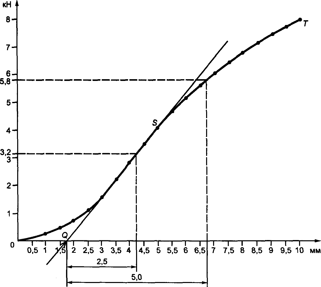 10.1.1 По полученным значениям усилий при погружении плунжера (штампа) строят график. Если начальная часть кривой вогнута вниз, необходимо провести корректировку расположения точки начала отсчета. Пример графика с корректировкой приведен на рисунке 3. Корректировку положения точки начала отсчета выполняют путем построения касательной с максимальным количеством точек соприкосновения с кривой. Точка пересечения касательной Q с осью абсцисс будет являться новым началом отсчета для определения значения усилий при погружении плунжера на 2,5 и 5 мм.