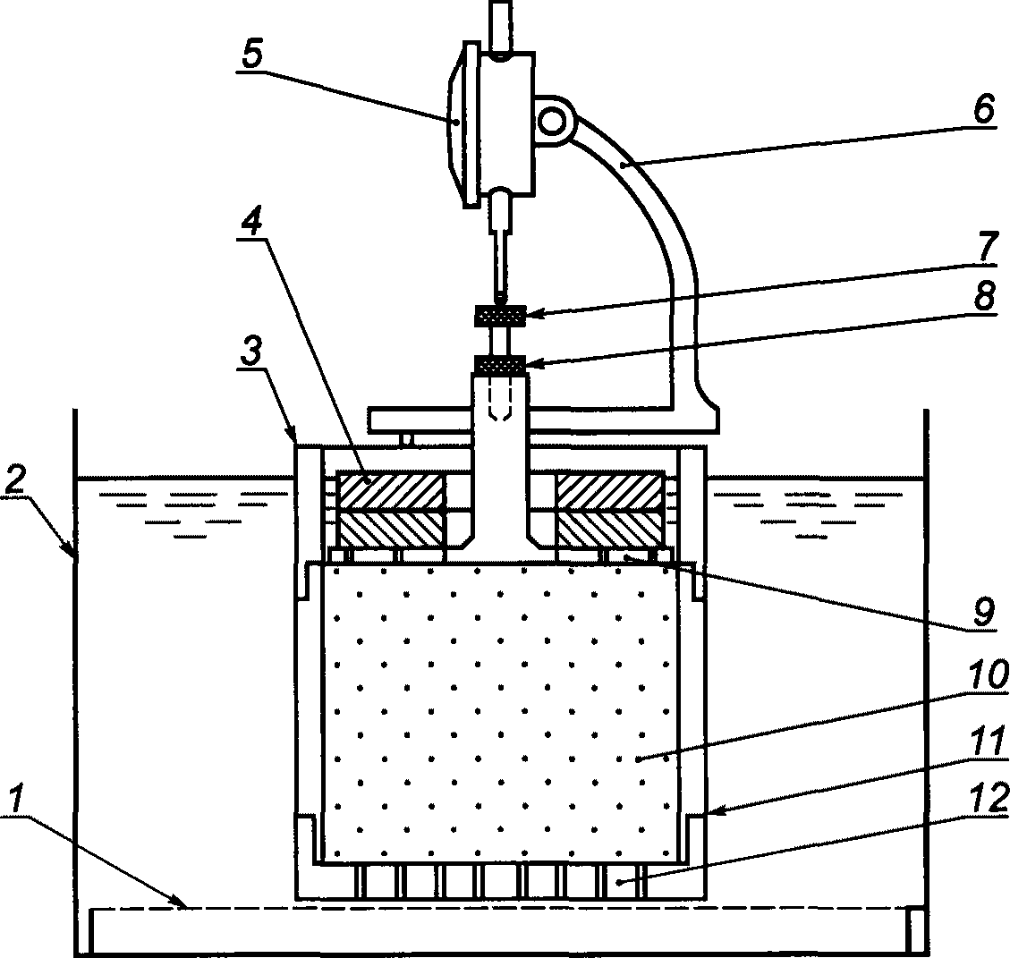 - емкость для насыщения образцов водой геометрическими размерами, позволяющими устанавливать в нее форму, при этом высота емкости должна быть не менее высоты сборной формы;