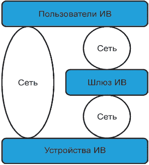 рисунке 1. Сети обеспечивают связи между пользователями ИВ, шлюзом ИВ и устройствами ИВ.