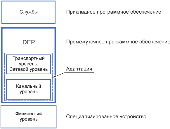 При работе на канальном или физическом уровне DEP должен быть подключен к уровню через функцию адаптации. Функция адаптации объединяет различные интерфейсы на канальном или физическом уровне с интерфейсом сокета (см.