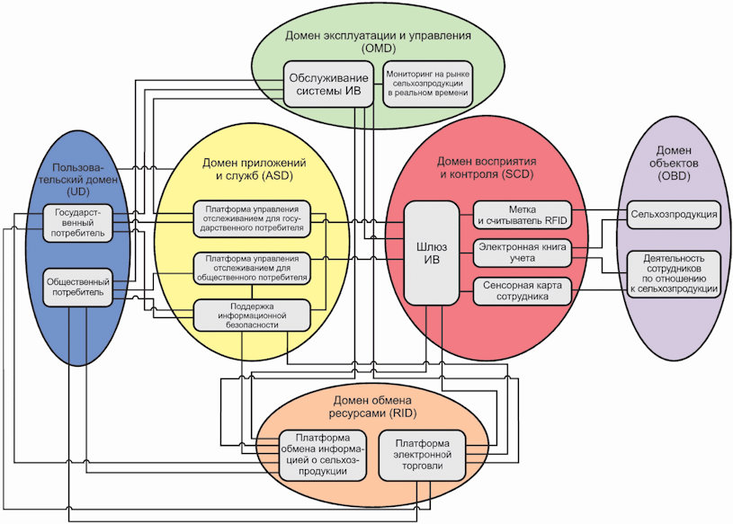 На представленной схеме различные сенсорные данные (например, данные RFID, данные о сельскохозяйственной продукции, данные сенсорной карты сотрудника) собираются на каждой стадии в цепочке поставок (например, при производстве, обработке, транспортировке и продаже). Проводится централизованный административный контроль данных.