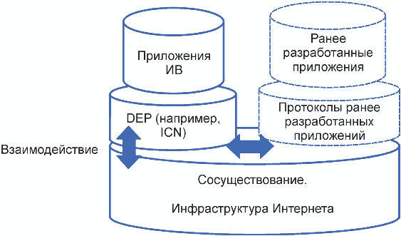 2). DEP может кэшировать данные. Впоследствии, когда пользователь ИВ запрашивает передачу данных, DEP передает данные из кэша вместо устройства ИВ. К механизмам передачи данных применяются технологии ICN, которые описаны в
