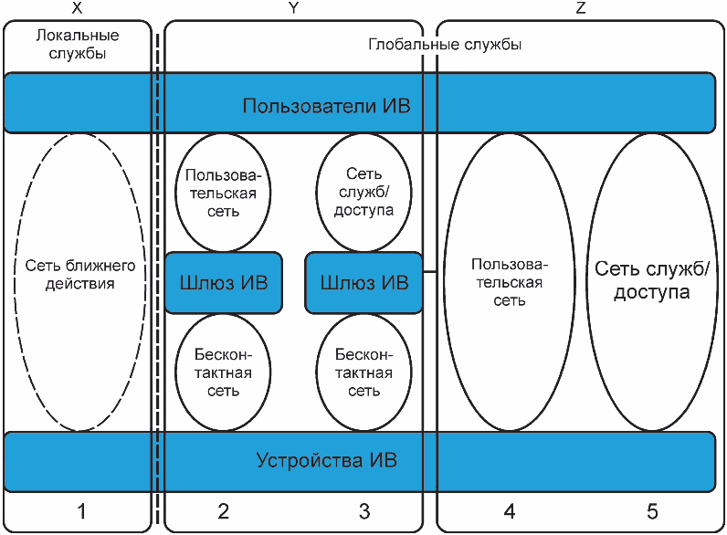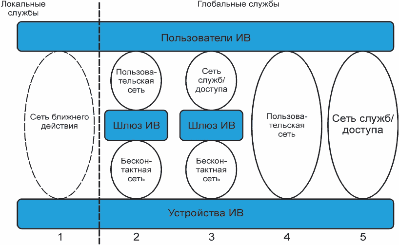 рисунке 2. Конфигурации сети включают в себя пять типов служб. Тип службы 1 представляет локальные службы для ограниченных областей. Типы служб 2 - 5 представляют глобальные службы. В глобальных службах для связи между пользователями ИВ и устройствами ИВ может использоваться шлюз ИВ. Сеть ближнего действия обеспечивает связь для ограниченных областей. Для глобальных служб развертываются пользовательская сеть, сеть служб и сеть доступа. Пользовательская сеть используется для приложений ИВ и управляется пользователем ИВ. Сеть служб и сеть доступа поддерживают общие приложения, в том числе специальные приложения ИВ и существующие приложения (например, телефонию, распространение видео и доступ в Интернет). Сеть служб включает в себя функции переключения между местоположениями. Сеть доступа обеспечивает функции мультиплексирования потока трафика из определенной области.