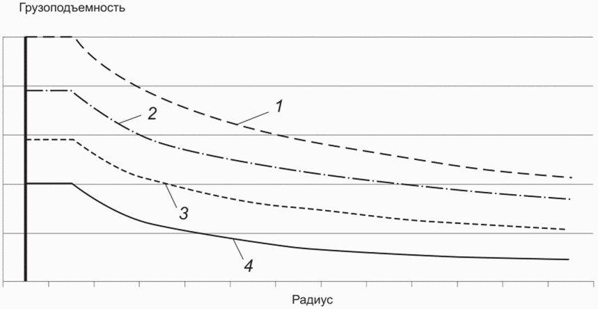 3.19 схема распределения нагрузок (load chart): Диаграмма или таблица, показывающая номинальную грузоподъемность в зависимости от радиуса или угла стрелы, условий окружающей среды, влияний нагрузок вне плоскости стрелы и типа операции.