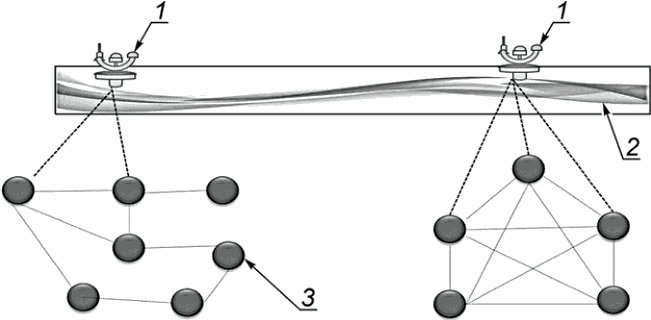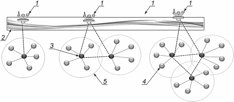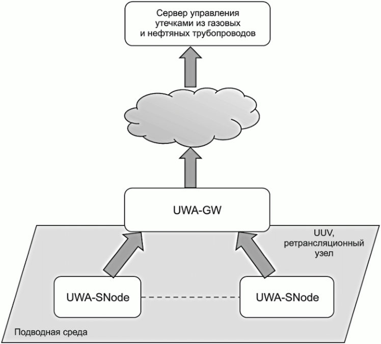 В системе UWASN могут быть использованы фиксированные или мобильные узлы (например, UUV, ретрансляционный узел), которые передают данные об утечках из трубопроводов на узел UWA-GW.