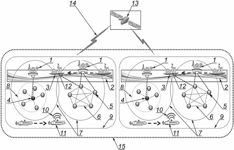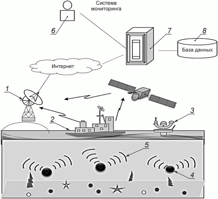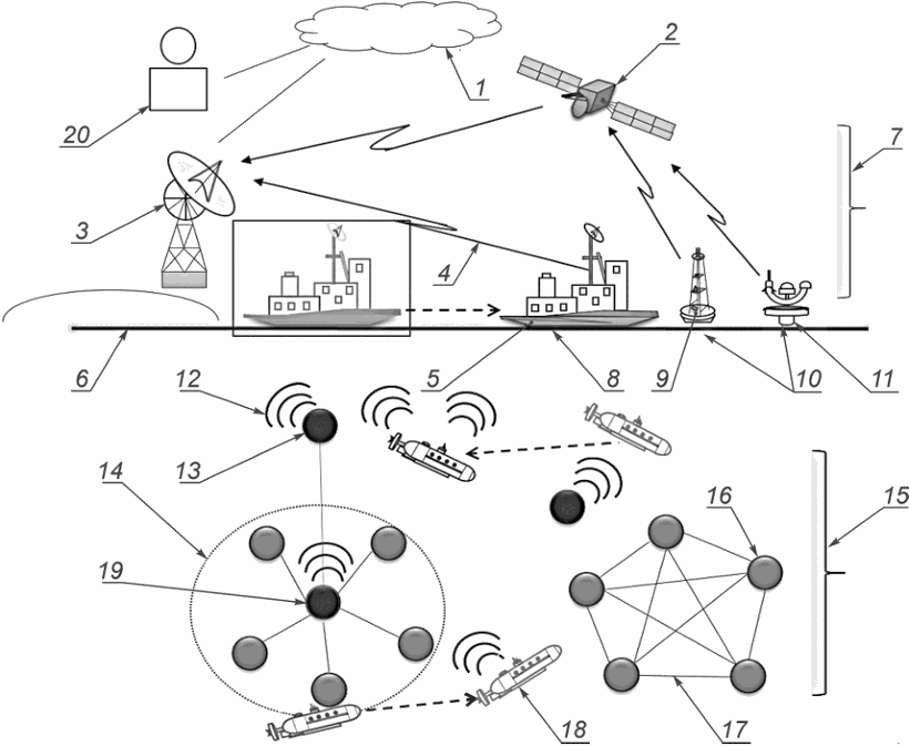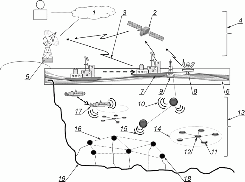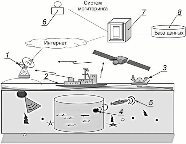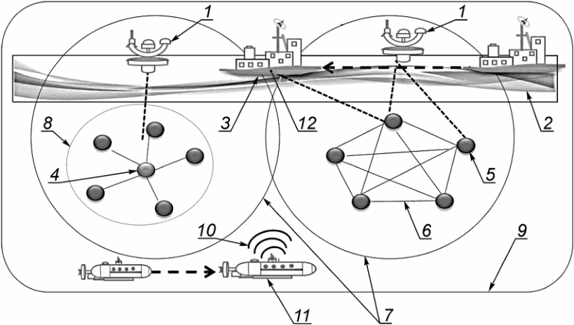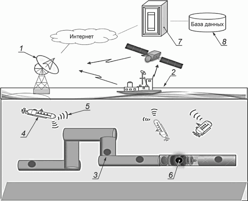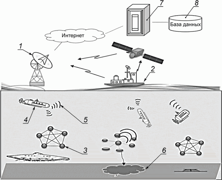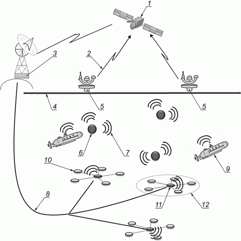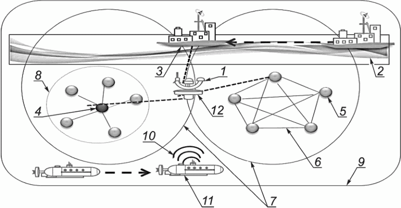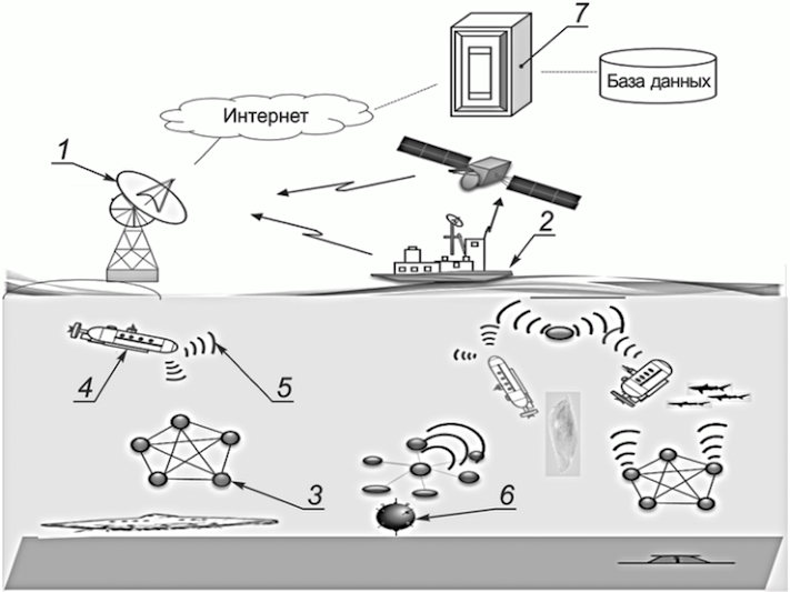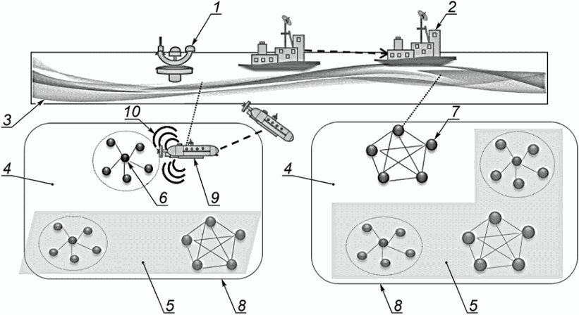 5 - акустическая связь; 6 - обнаружение мин; 7 - сервер