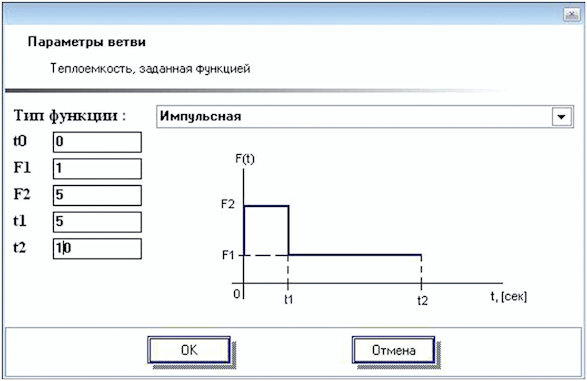 Теплоемкость в общем случае зависит от времени и может задаваться как в виде таблицы зависимости теплоемкости от времени, так и в виде нескольких функций: импульсная, синусоидальная, пилообразная и сложная. Каждая функция имеет свой набор характерных точек. Ниже приведены примеры для переменной - теплоемкость. Типы функций для других переменных формируются аналогично.