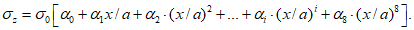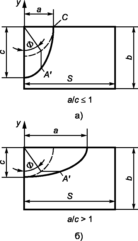 Для расчета КИН в произвольной точке A' фронта трещины с относительной глубиной a/S < 1, при 0,2 <= a/S <= 2 используют следующие формулы: