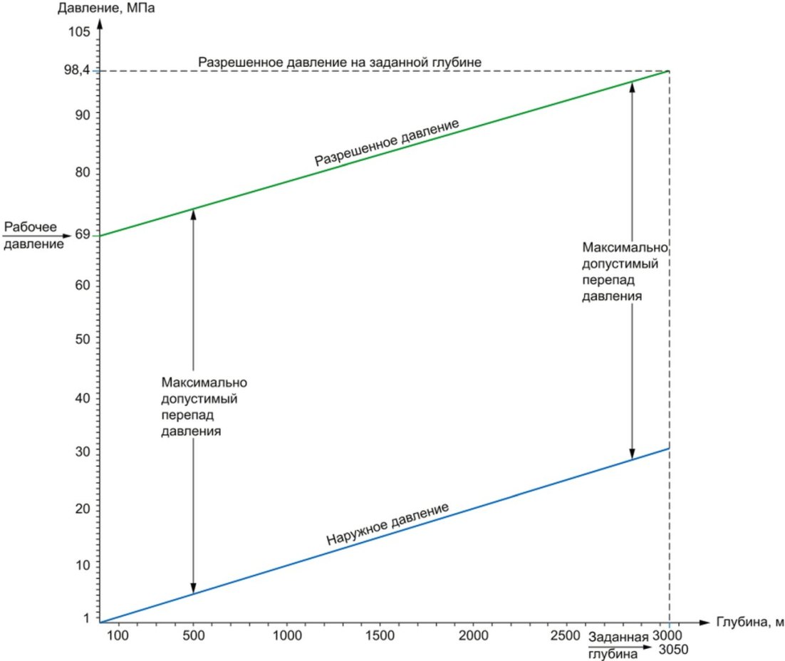 5.3 Для оборудования, предназначенного для эксплуатации на глубинах, при которых требуется учитывать влияние наружного давления, требуется выполнение расчета и подтверждения работоспособности. Например, для арматуры с внутренним гидростатическим давлением 69 МПа (703,6 кгс/см2), расположенной на глубине 3000 м, где наружное давление составляет 30 МПа (300 кгс/см2), перепад давления составляет 39 МПа (397,7 кгс/см2).