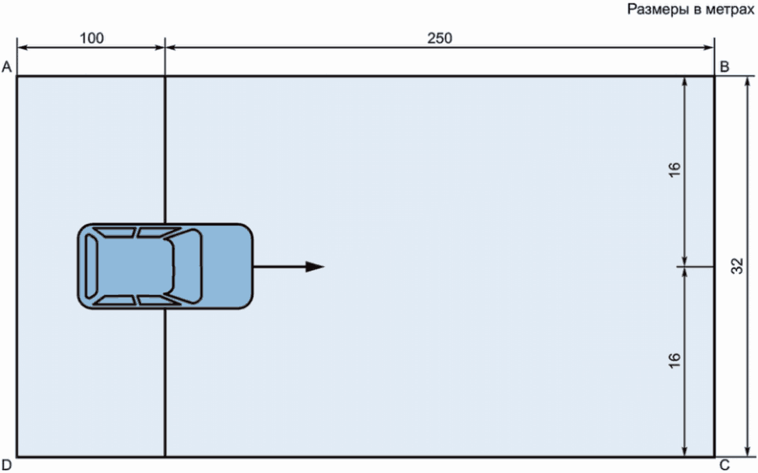 Подключенное транспортное средство размещают в углах A, B, C и D, как показано на