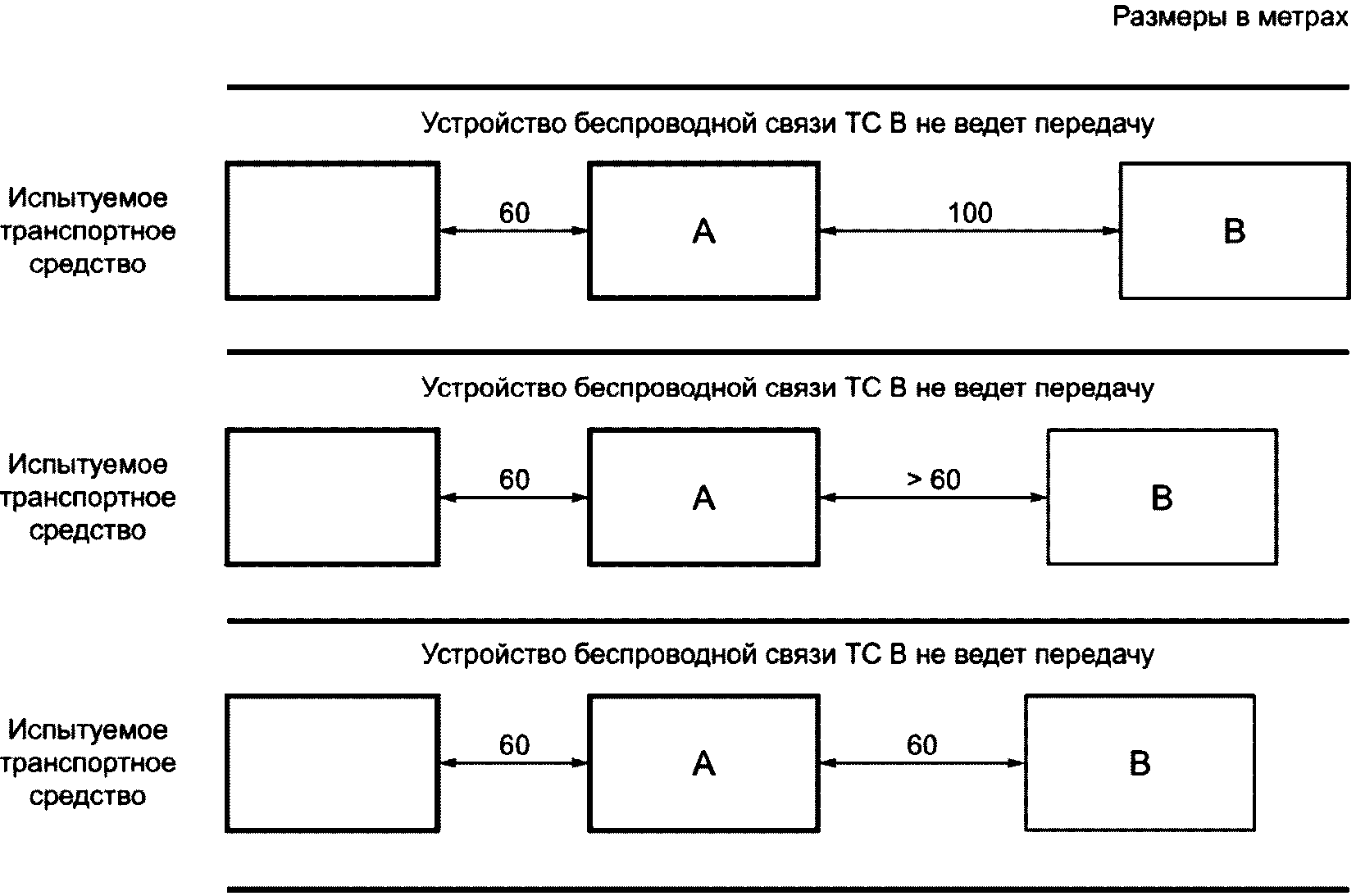 рисунке 8 испытуемое транспортное средство следует за транспортным средством-мишенью (A), которое не подключено (режим АКК). Оба транспортных средства движутся со скоростью 27 м/с (20 м/с для грузовых автомобилей) на расстоянии около 60 м (промежуток времени 2 с). Другое транспортное средство (B) движется в полосе движения рассматриваемого транспортного средства со скоростью 20 м/с (14 м/с для грузовых автомобилей) и опережает транспортное средство-мишень на 100 м.