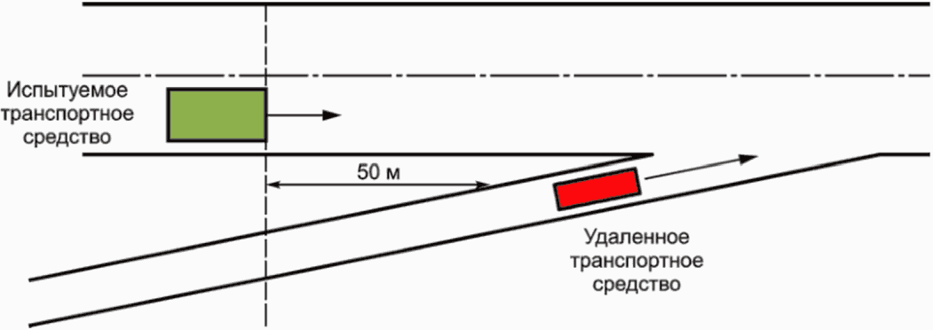 Испытуемое транспортное средство приближается к слиянию на расстоянии около 50 м и движется с установленной скоростью 27 м/с (20 м/с для грузовых автомобилей). Подключенное дистанционное транспортное средство, движущееся справа от рассматриваемого транспортного средства, имеет скорость 20 м/с (14 м/с для грузовых автомобилей). Проверка будет успешной, если кооперативная система КАКК V2V сообщает о своем рабочем состоянии как режим Non-Follow до того, как удаленно подключенное транспортное средство присоединится к полосе рассматриваемого транспортного средства.