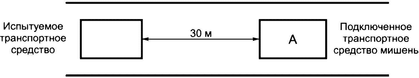 рисунке 9 испытуемое транспортное средство следует за транспортным средством-мишенью (A), у которого устройство подключения выключено (испытываемое транспортное средство находится в режиме АКК). Оба транспортных средства движутся со скоростью 27 м/с (20 м/с для грузовых автомобилей) на расстоянии около 30 м (интервал времени 1 с). На транспортном средстве A подключенное автомобильное устройство включается на расстоянии около 30 м от испытуемого транспортного средства. Когда данные в эфире адекватно коррелируют с данными активного зондирования (требование:
