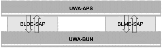 Функциональные сущности на уровне UWA-DL получают доступ к данным на уровне UWA-PHY (данные датчиков) с помощью PLDE-SAP. Уровень UWA-DL управляет оборудованием на уровне UWA-PHY (исполнительное устройство и драйверы оборудования) с помощью PLME-SAP.