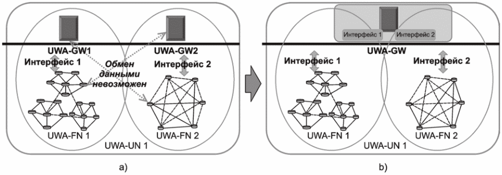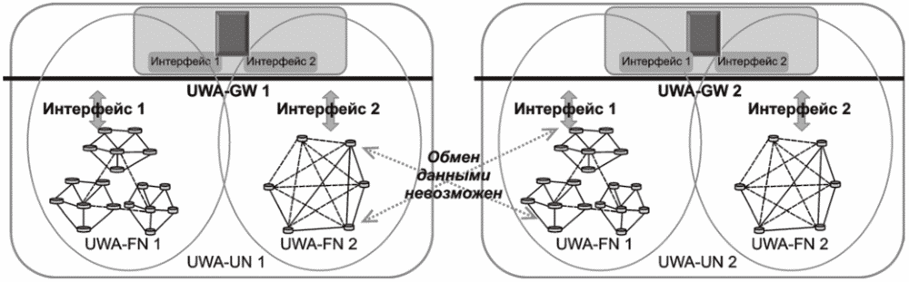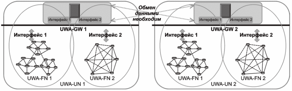 На рисунке 6 в UWA-UN 1 сенсорный узел ad-hoc сети может взаимодействовать с головным узлом кластерной сети UWA-UN 2. При этом прямое взаимодействие невозможно, и требуется общий шлюз для взаимодействия между двумя сетями UWA-UN.