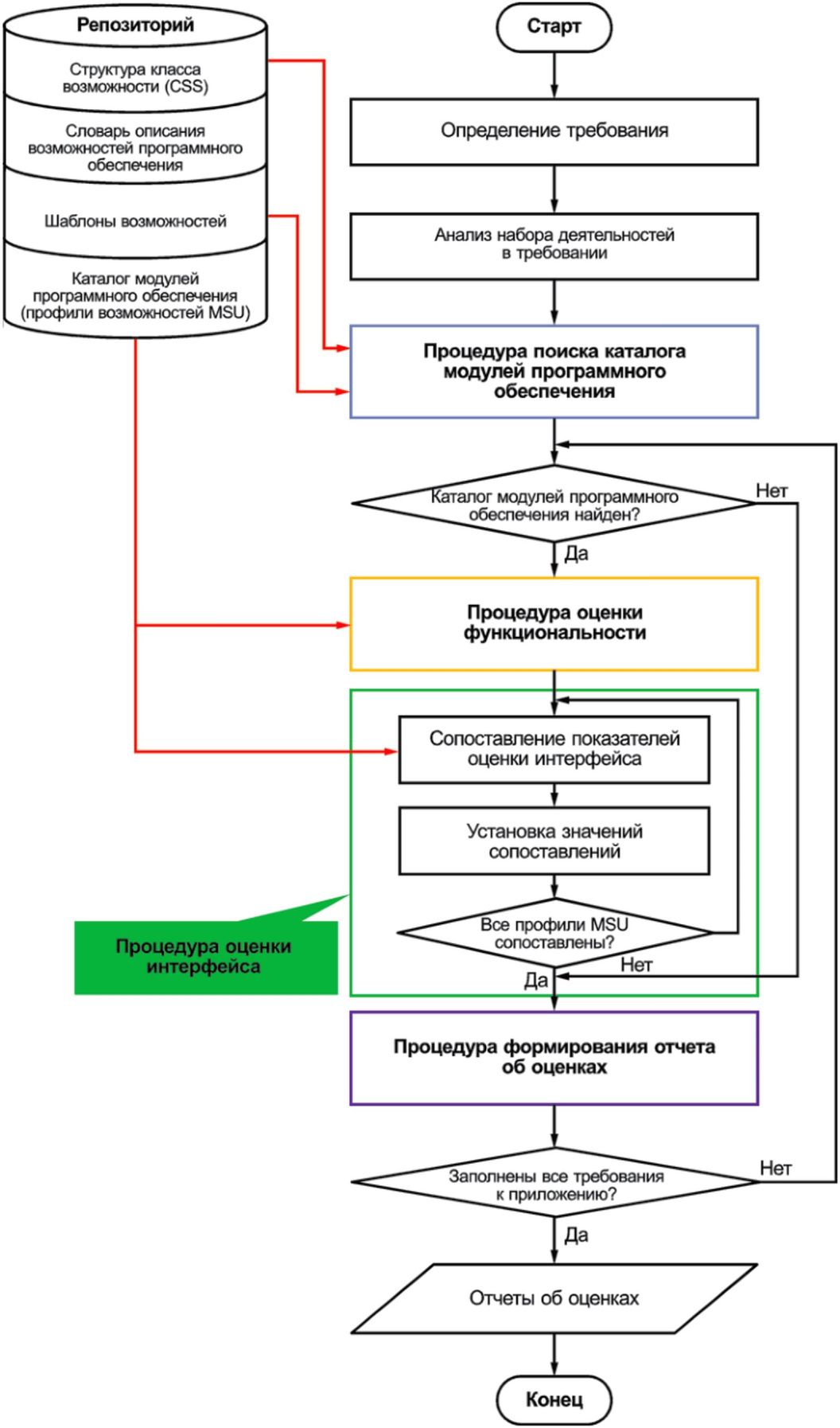 в) процедура оценки интерфейса. Данная процедура обеспечивает сопоставление интерфейса требуемого профиля возможностей с профилями возможностей MSU в каталоге модулей программного обеспечения;