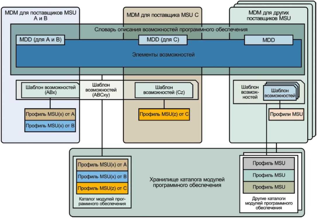 ПНСТ 435-2020. Для перевода семантики шаблона возможностей и профилей возможностей каталог модулей программного обеспечения ссылается на словарь описания возможностей программного обеспечения. Каждый MSU имеет один профиль возможностей, который принадлежит одному шаблону возможностей в каталоге модулей программного обеспечения. Пример шаблона возможностей представлен в