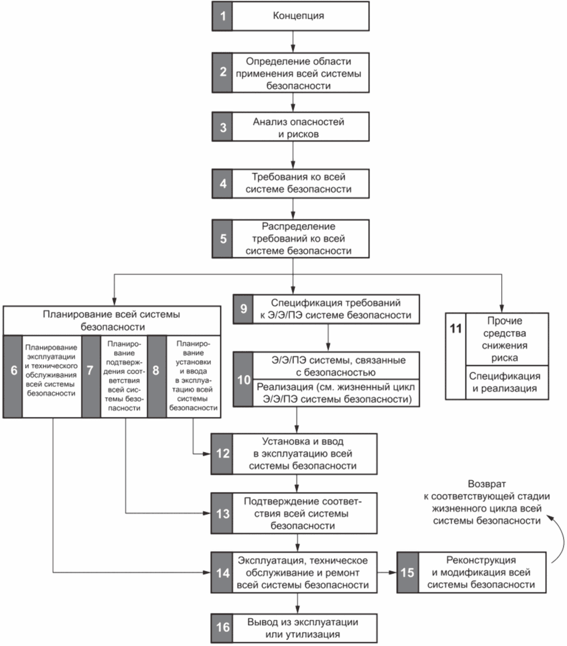 ГОСТ Р МЭК 61508-1 описывает жизненный цикл безопасности как серию фаз.