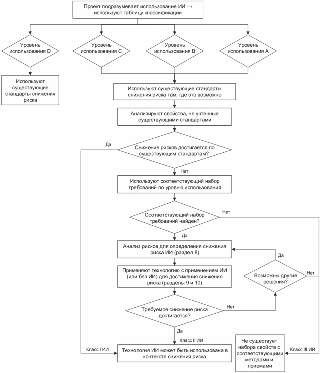 разделе 6 представлены разные классы технологии ИИ, чтобы показать их соответствие существующим стандартам функциональной безопасности в том случае, когда технология ИИ является частью функции безопасности. В