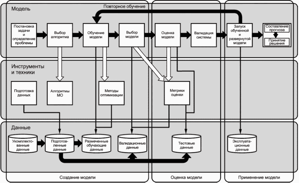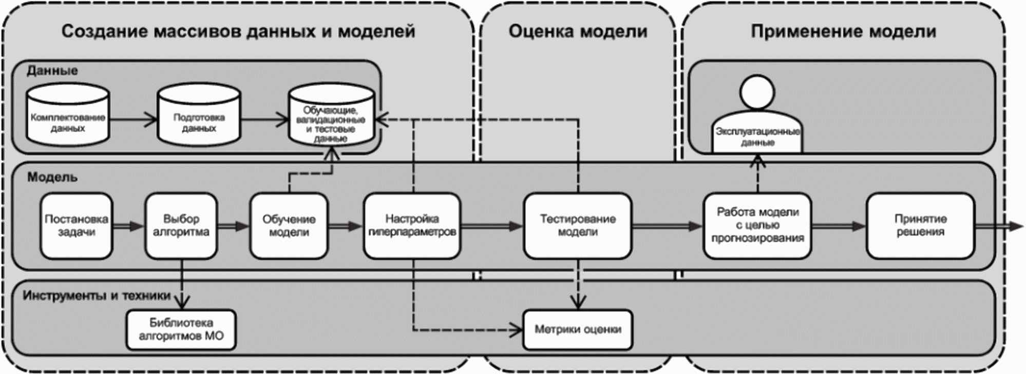 Создание модели первоначально включает в себя такие этапы, как "определение задачи" и "формулирование задания", которые устанавливают цели и требования к решению. Затем следует этап "выбор алгоритма", целью которого является выбор метода МО, наиболее подходящего для обеспечения требуемого решения. Этап "обучение модели" включает в себя создание обученной пробной модели путем использования размеченных обучающих данных. При выборе модели вычисляют метрики оценки на валидационных данных для выбора окончательной модели МО среди пробных вариантов.