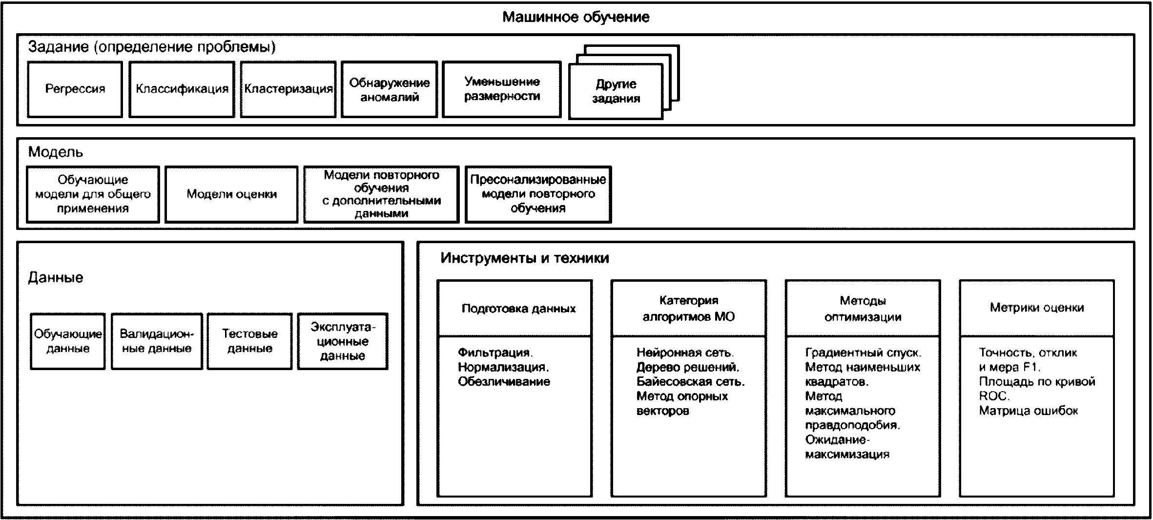 Машинное обучение (МО) - это направление ИИ, использующее вычислительные методы для того, чтобы дать системам возможность учиться на основе данных и опыта. Таким образом, системы МО разрабатываются путем оптимизации алгоритмов, обеспечивающей соответствие обучающим данным и повышение эффективности посредством максимизации вознаграждения. Методы МО включают глубокое обучение, также рассматриваемое в настоящем стандарте.