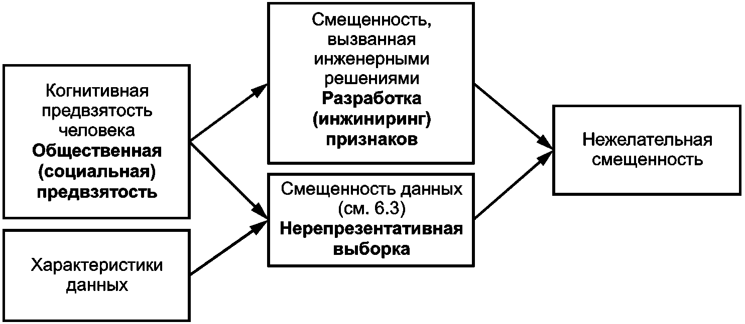 Системы ИИ часто обучаются на основе реальных данных; следовательно, модель МО может обучиться на основе проблемной смещенности данных или даже усилить эту смещенность. Такая смещенность может потенциально благоприятствовать или не благоприятствовать определенным группам людей, объектов, концепций или результатов. Даже если данные кажутся беспристрастными, самое тщательное кросс-функциональное обучение и тестирование все равно может привести к созданию модели МО с нежелательной смещенностью. Более того, устранение или уменьшение одного вида смещенности [например, социальной/общественной смещенности/предвзятости (societal bias)] может повлечь за собой появление или увеличение другого вида смещенности (например, статистической смещенности