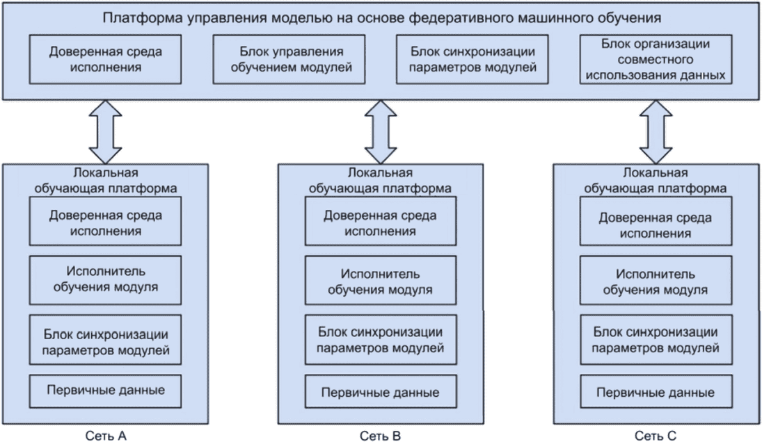 Основу вычислительной платформы составляет управляющий модуль, который распределяет вычислительные задачи между различными поставщиками данных и осуществляет координацию обучающих модулей поставщиков данных. Затем модули обучения поставщиков данных обмениваются между собой случайными числами и/или зашифрованными параметрами с целью выполнения операции федеративного МО.