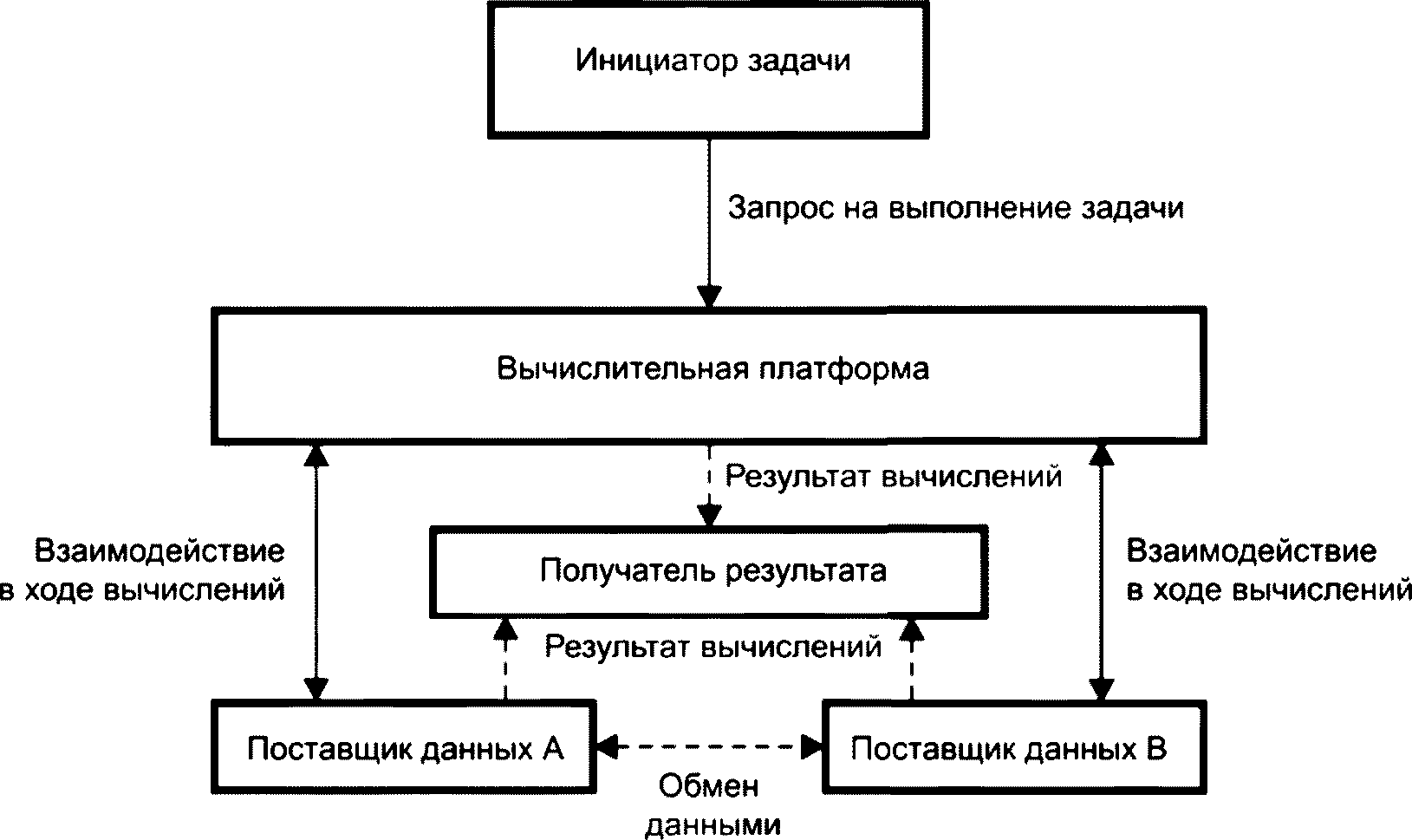 рисунке 1 показаны только два поставщика данных, однако при реальном развертывании решения таких поставщиков данных может быть много. Одна и та же сторона может выступать в качестве исполнителя нескольких ролей, например: один из поставщиков данных может быть инициатором задачи и/или получателем результата.