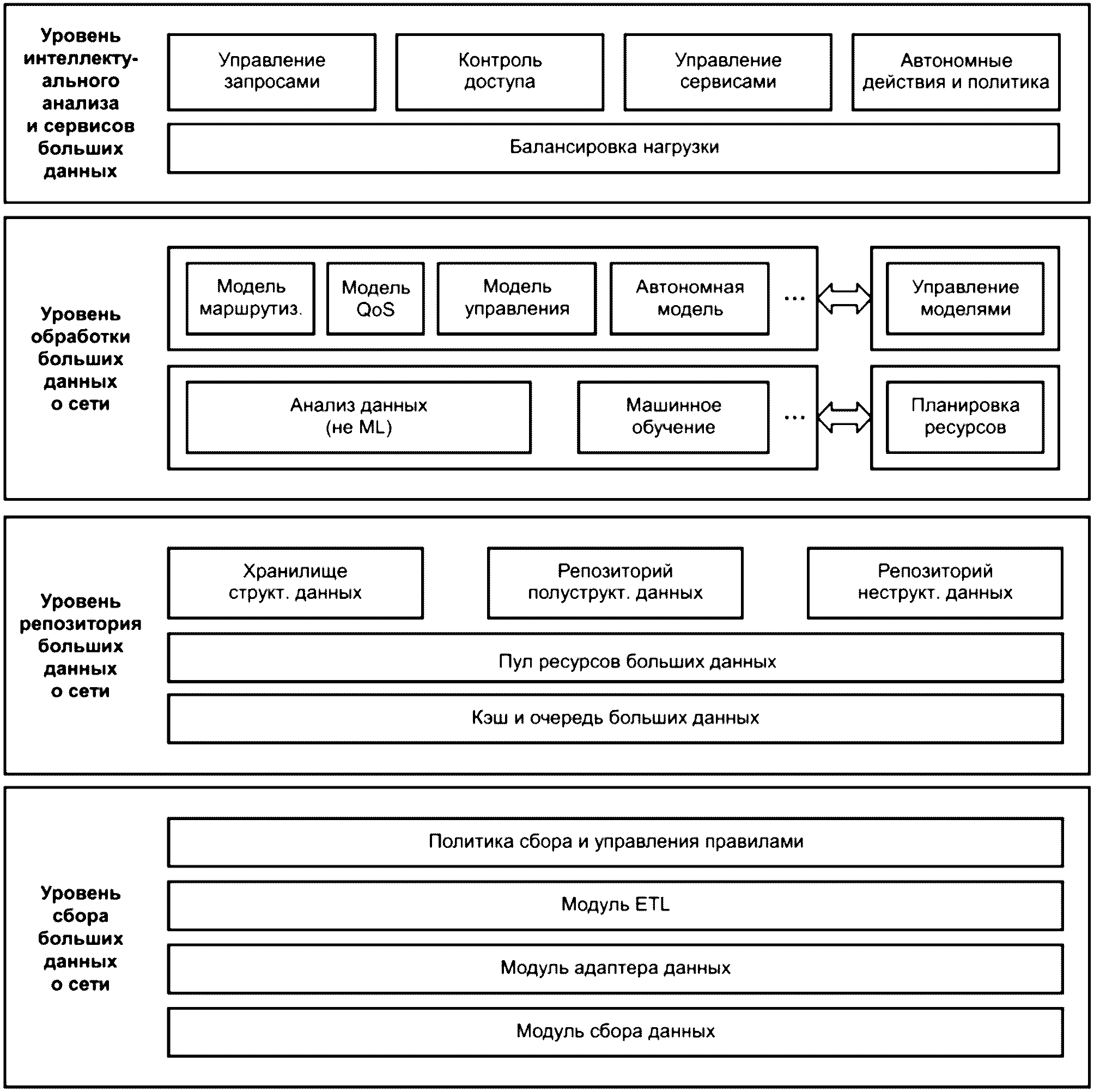 [3]) и других технологий собирает различные данные (в том числе о трафике, производительности сетевых устройств, управлении и эксплуатации сети) из сети научным образом. Плоскость больших данных также собирает данные о некоторых внешних обстоятельствах, которые могут оказать влияние на сети. Такая массивная и всеобъемлющая информация в реальном времени из всех измерений сети и внешней среды имеет решающее значение для раскрытия истинных сетевых обстоятельств и проблем, в отличие от текущих неинтуитивных, утомительных действий по поиску и устранению неисправностей и защите от хакеров. Собранные данные хранятся в репозитории, основанном на облачной архитектуре, а функция репозитория хранения данных развернута на уровне репозитория данных. Для реального решения сетевых проблем и снижения сложности сети необходим уровень обработки данных (уровень вычислений и анализа), на котором применяются различные сетевые модели и возможности облачных вычислений, хотя собранные данные содержат всю необходимую информацию. Вычислительные методы, модели, возможности и даже форма результатов могут быть либо предварительно сконфигурированы, либо заново выданы на уровне интеллектуального анализа данных. Уровень интеллектуального анализа и сервиса должен дополнительно преобразовывать результат в удобное представление информации и давать четкие инструкции (в соответствии с топологией, производителем устройства, состоянием сети и т.д.), а также предоставлять сквозной сетевой интеллектуальный анализ для двух других плоскостей в виде сервиса.
