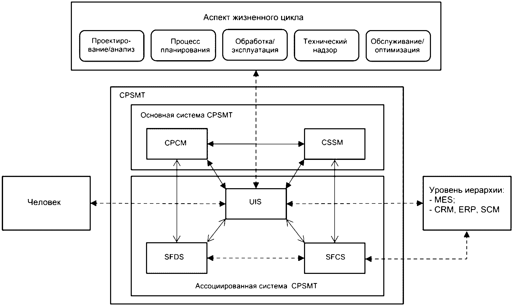 3.1.5 ассоциированная система CPSMT (CPSMT associated system): Набор компонентов CPSMT для взаимодействия с первичной системой CPSMT, в том числе система цеховых устройств (SFDS), система управления цехом (SFCS) и система единого интерфейса (UIS).