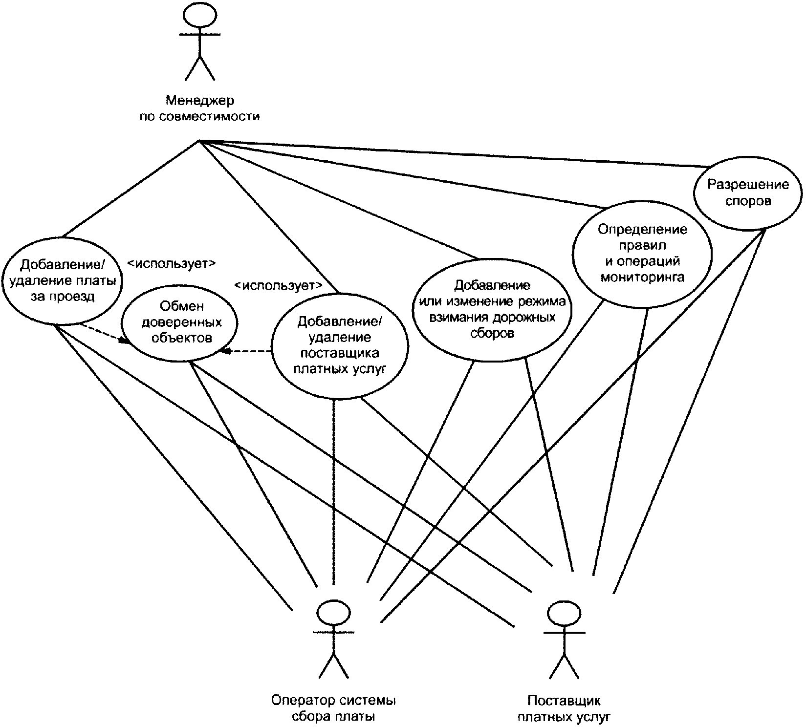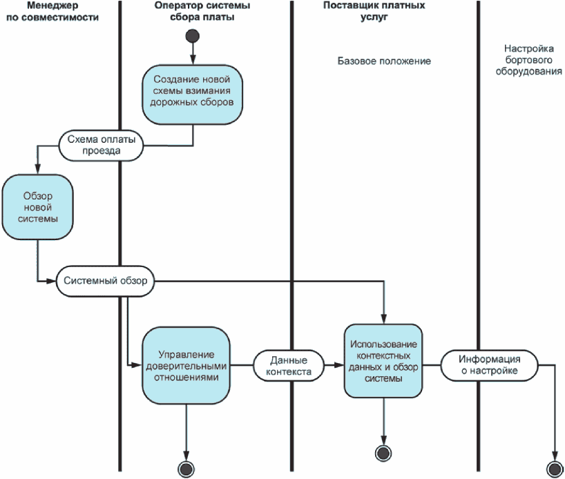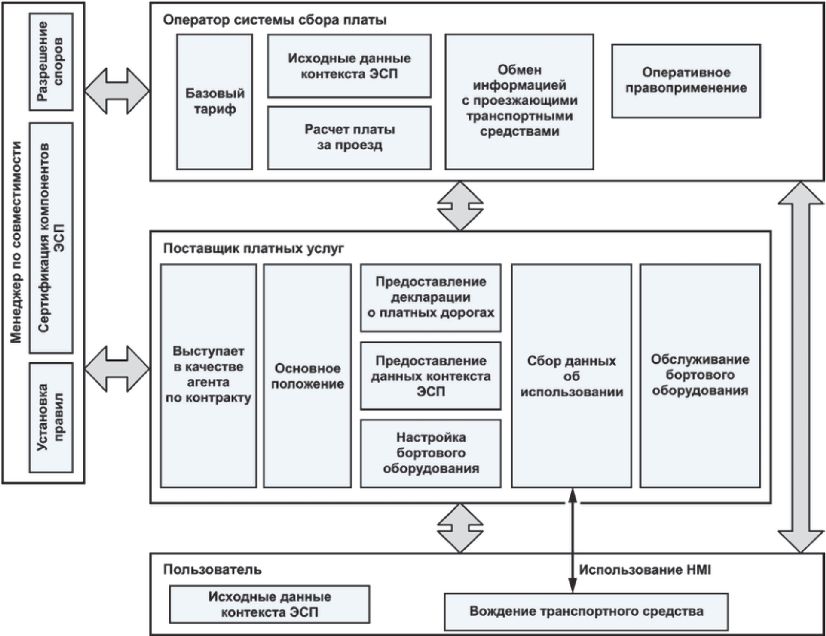 - оператор системы сбора платы будет действовать как пользователь услуги идентификации пользователя, идентификации тарифа для начисления платы и обмена информацией о транспортном средстве в платной зоне, а также как поставщик контента для обмена информацией о начислении платы;
