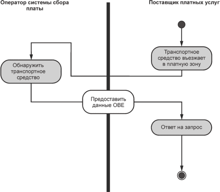 рисунке 17 показана диаграмма взаимодействия между оператором сбора платы и поставщиком платных услуг в системе на основе SRC. Сбор информации о транспортных средствах в платных зонах происходит в домене системы мобильной связи ближнего действия, когда субъект, играющий роль оператора системы сбора платы, распознает присутствие OBE. Чтобы охватить самый общий случай, на диаграмме показан обмен идентификационной информацией, при котором оператор системы сбора платы идентифицирует пользователя, а поставщик платных услуг распознает область взимания платы.