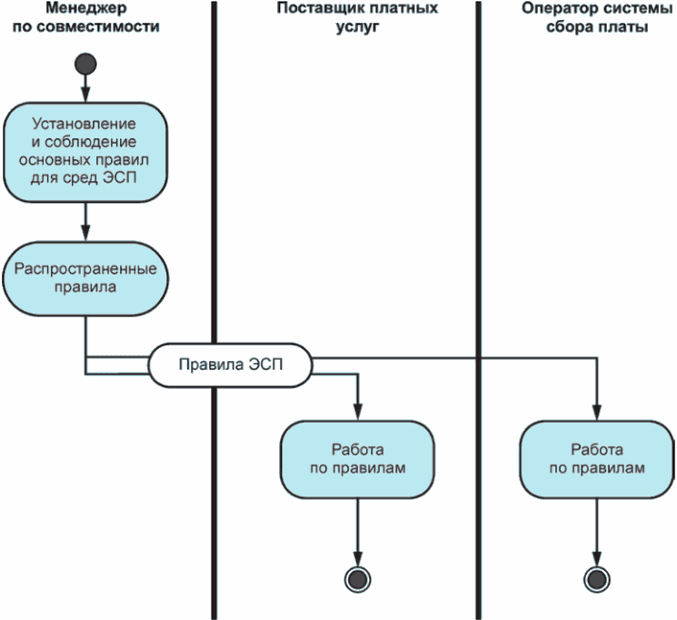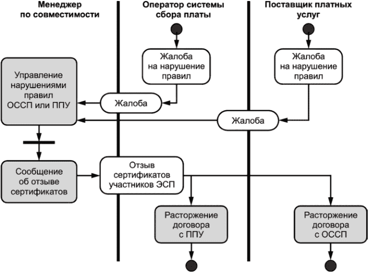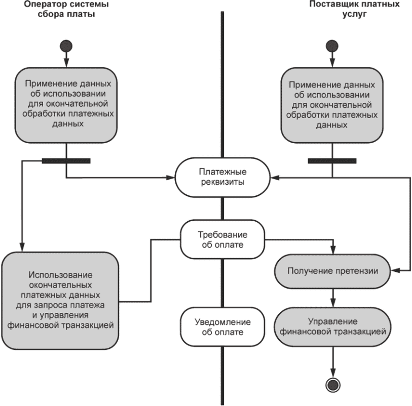 - оператор системы сбора платы должен действовать как получатель информации уведомлений о платежах и как получатель информации или поставщик контента платежных данных, в зависимости от типа системы взимания платы. Оператор системы сбора платы должен выступать в качестве пользователя услуги при взаимодействии с платежным требованием.