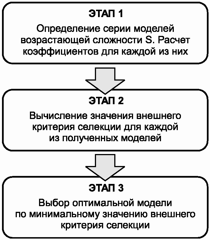 Процесс моделирования с использованием МГУА условно можно разделить на три этапа, представленные на рисунке 1.