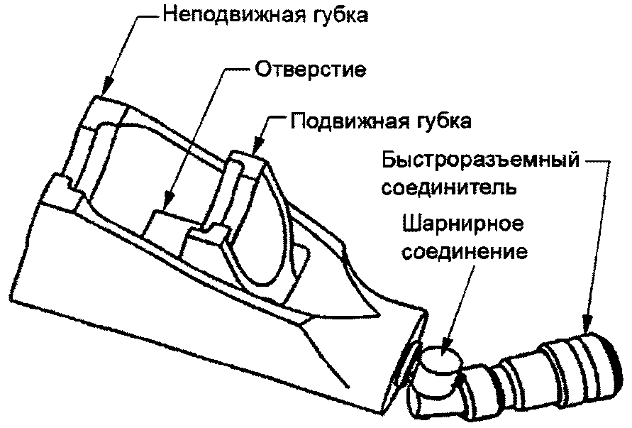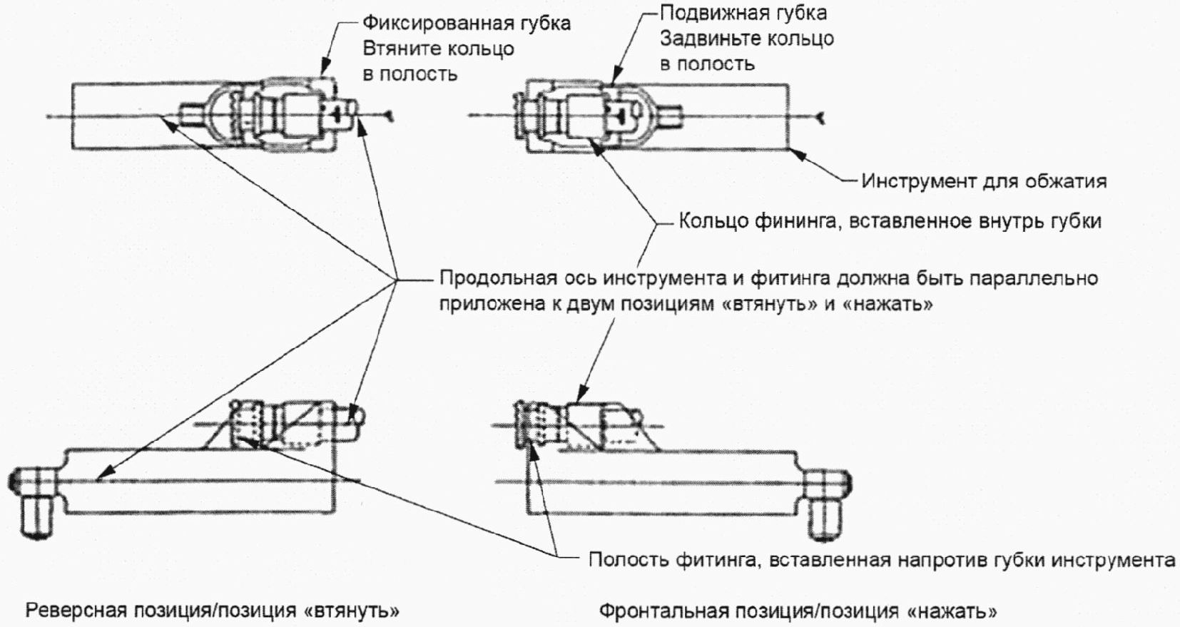 Запрессовка может осуществляться по обратной схеме, при которой неподвижная губка упирается в торец подвижного кольца фитинга без касания тела фитинга, как показано на рисунке 7.
