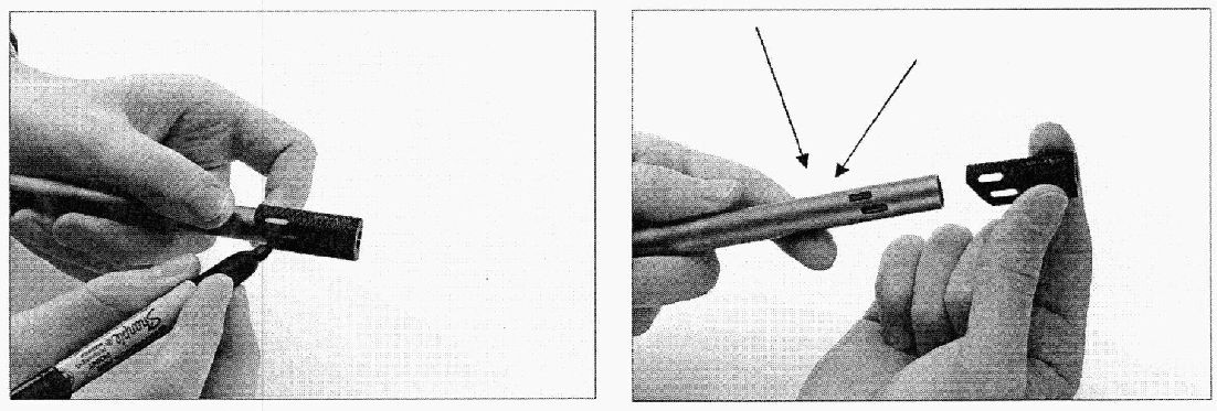 таблице 1 для каждого торца труб, перед установкой фитинга. Может применяться несколько способов нанесения постоянной маркировки (например, несмываемая краска, гравировка). Если торцы труб не маркированы, то необходимые маркировки должны быть нанесены с использованием устройства для маркировки труб, как показано на