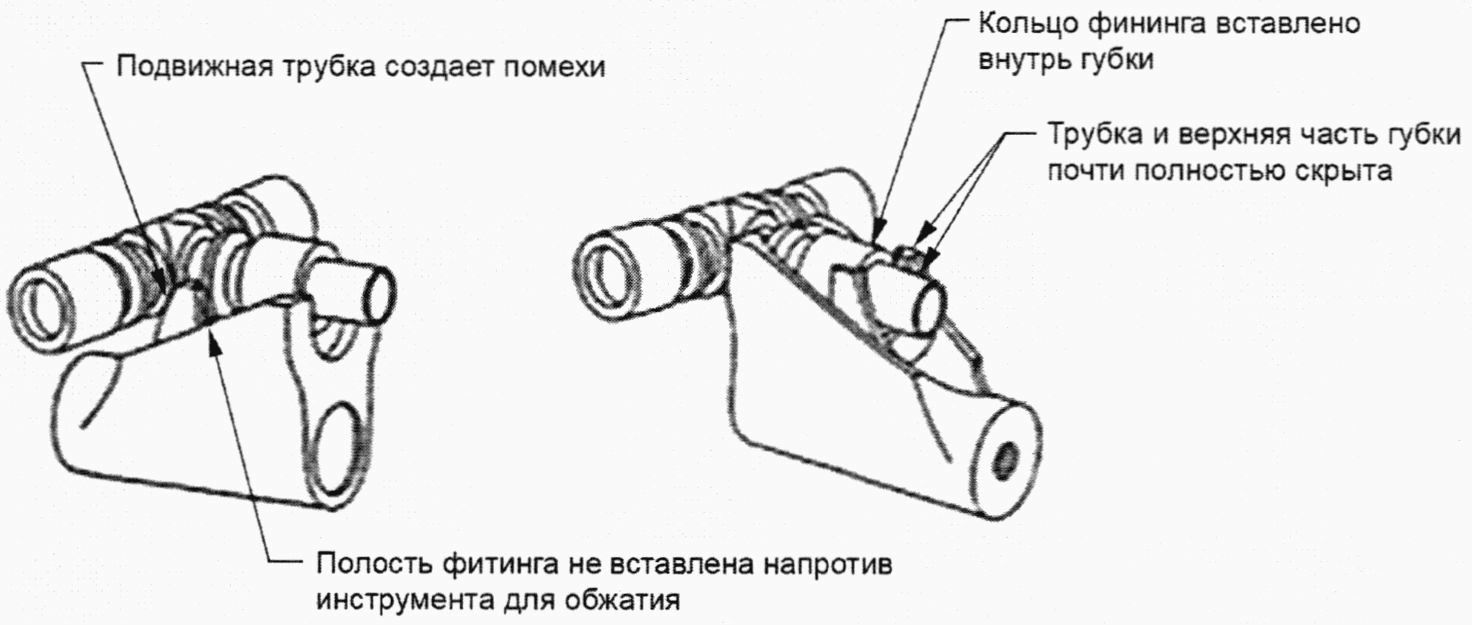 Фитинг должен надлежащим образом устанавливаться вглубь инструмента. Недостаточная глубина установки фитинга в инструмент может вызвать повреждение губок из-за чрезмерной нагрузки и привести к преждевременной поломке губок инструмента.