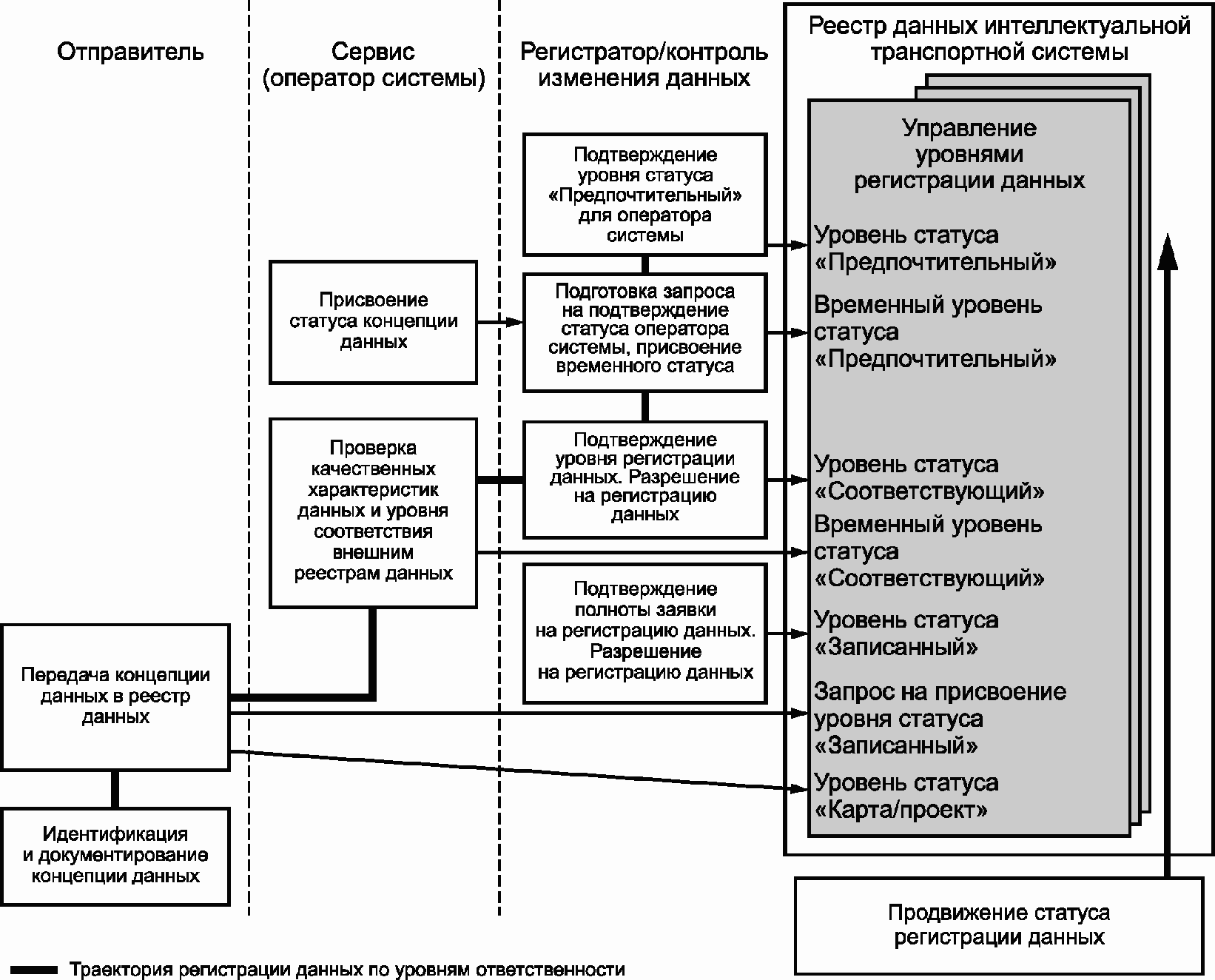 Настоящий стандарт содержит описание процесса регистрации данной информации в соответствии с международно-признанными технологическими процессами внедрения и обеспечения качества, определенными в международных стандартах, касающихся различных аспектов ИТС. В настоящем стандарте определены процедуры регистрации данных, а также процессы передачи и принятия данных. Единый для всех пользователей обновляемый РД должен обеспечивать процессы стандартизации и гармонизации при совместном использовании данной информации различными группами потребителей для исключения искажения и дублирования информации на разных этапах, включая формирование новых и дополнительных данных. Процессы определения стандартизованного набора протоколов, параметров, метода управления обновляемым РД описаны в соответствующих подразделах и приложениях настоящего стандарта.