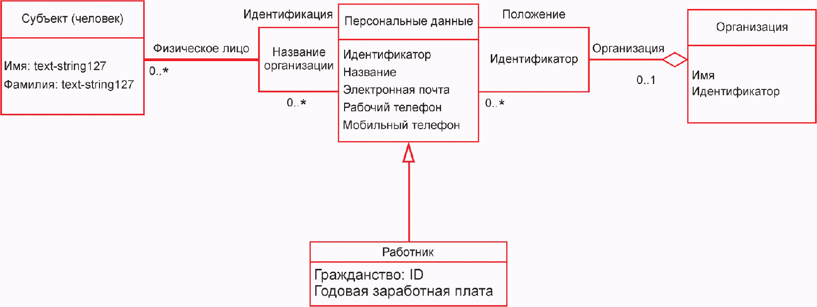 рисунке Ж.1 также указано, что свойство физических лиц типа "организация" может иметь любое количество экземпляров (например, тип "организация" может быть связан с нулем или множеством физических лиц) и что тип "человек" может быть связан с нулем или множеством организаций.