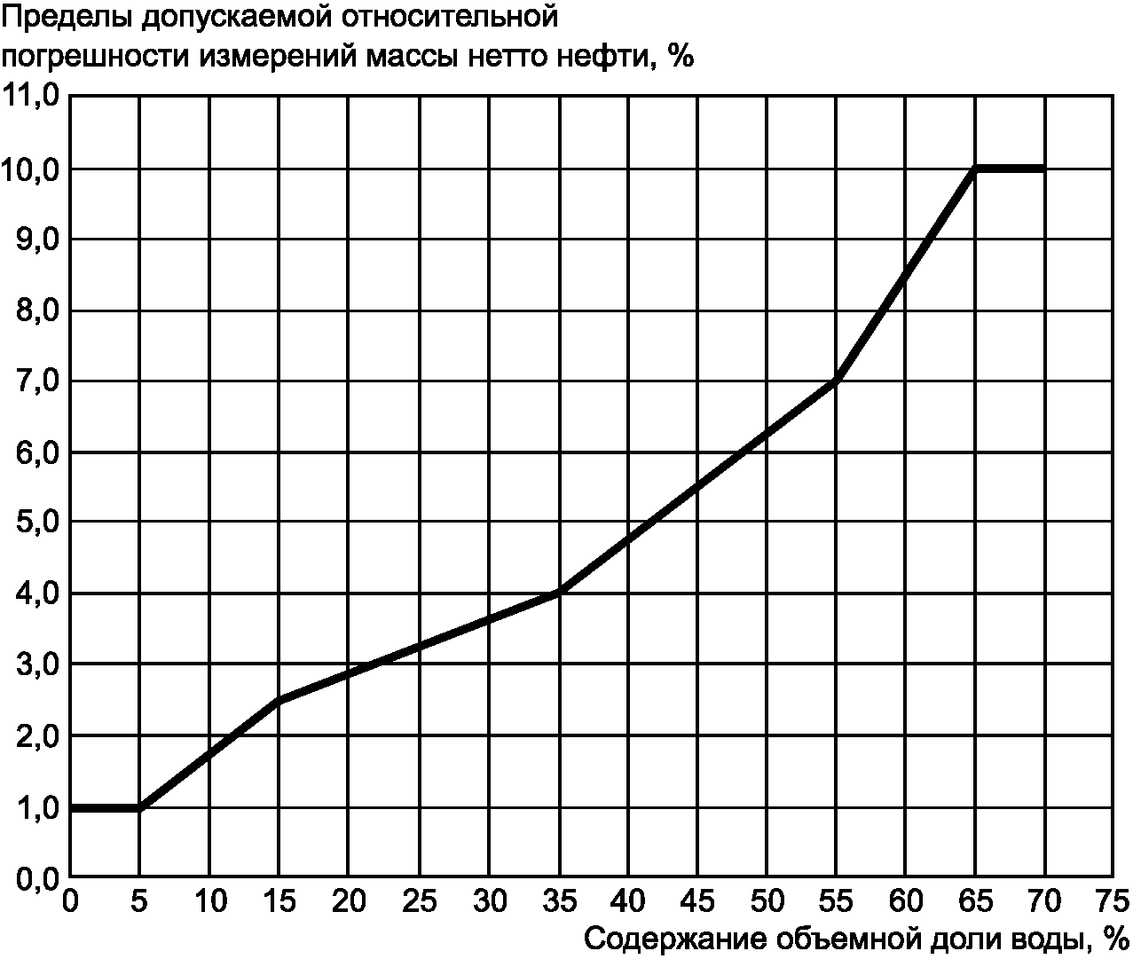 Пределы допускаемой относительной погрешности косвенных измерений массы нетто нефти в составе нефтегазоводяной смеси с применением СИКНС, на которых ведут учетные операции, в зависимости от содержания объемной доли воды, отображены графически на