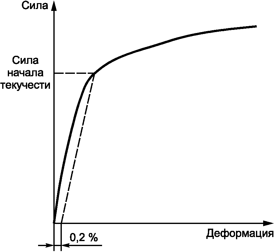 Силу начала текучести объекта испытаний определяют по диаграмме растяжения при деформации, соответствующей 0,2% первоначальной длины, измеренной между поверхностями приложения растягивающей силы на объекте испытаний. Для этого на диаграмме "сила - деформация" параллельно упругой части линии нагружения отмечают линию со смещением, соответствующим относительной деформации 0,2% первоначальной длины, измеренной между поверхностями приложения силы. Точка пересечения ее с диаграммой в упруго-пластической зоне соответствует силе начала текучести (см.