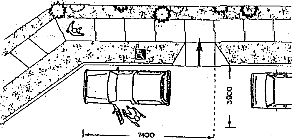 При горизонтальной парковке легковых автомобилей и специализированных автомобилей габаритов маршрутного такси необходимо пространство для маневрирования и загрузки кресла-коляски 3900 мм шириной и 7400 мм длиной.