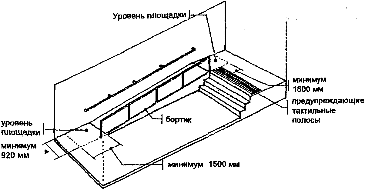 - тактильные и визуальные полосы на верхней лестничной площадке (тактильные полосы устраиваются во всю ширину лестничных площадок на глубину не менее 900 мм, включая нижнюю площадку);