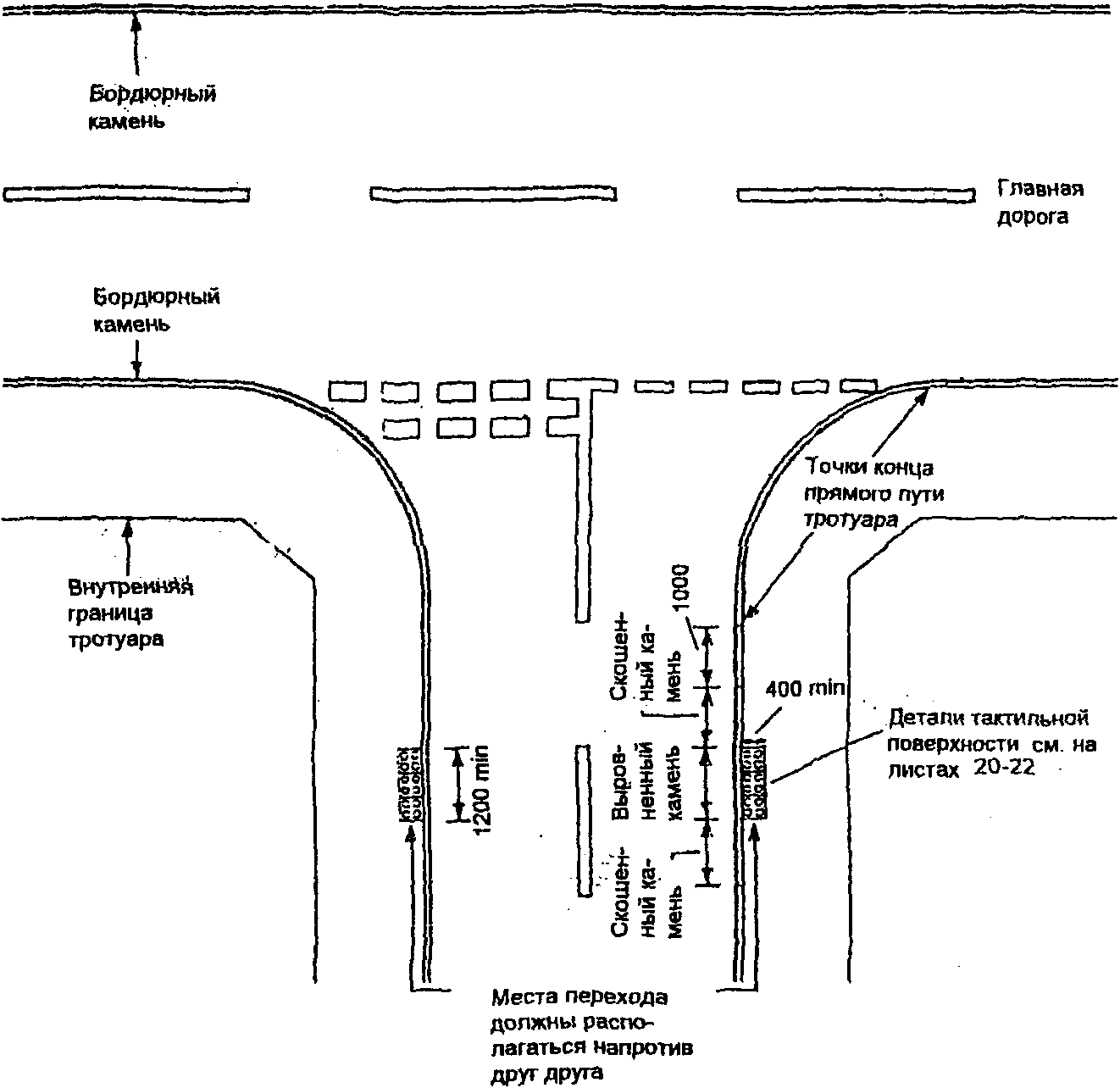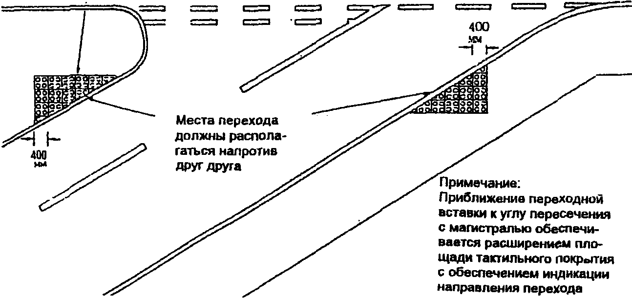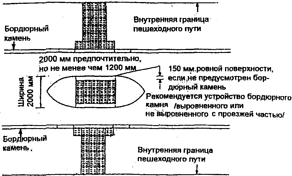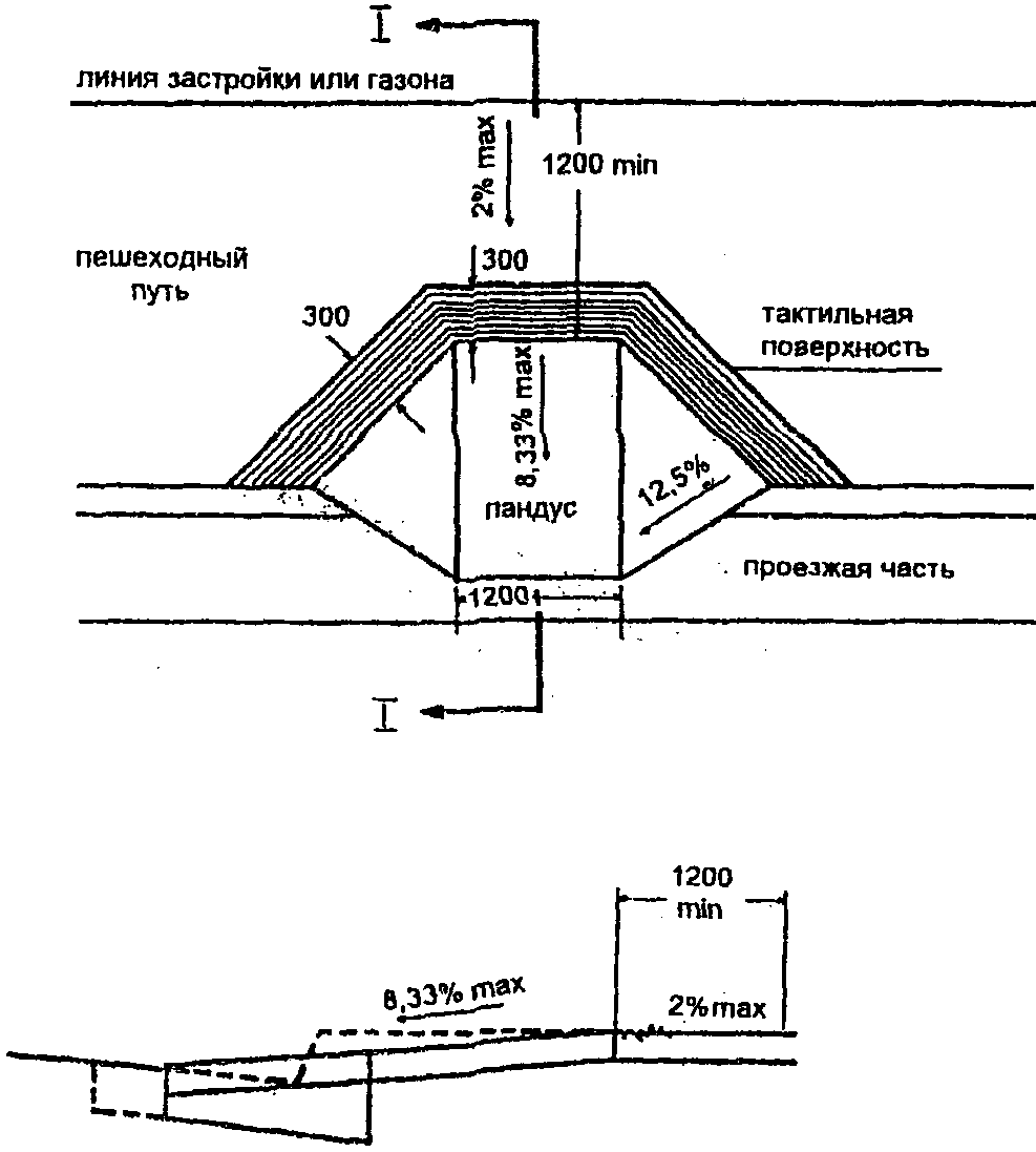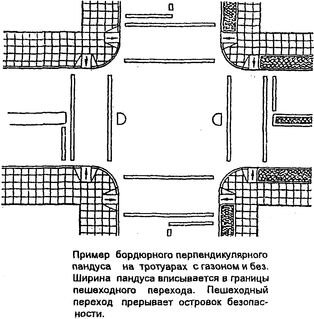 Так называемые "БОРДЮРНЫЕ" пандусы должны устраиваться на каждом пересечении улиц и там, где пешеходный путь пересекает бордюрный камень.
