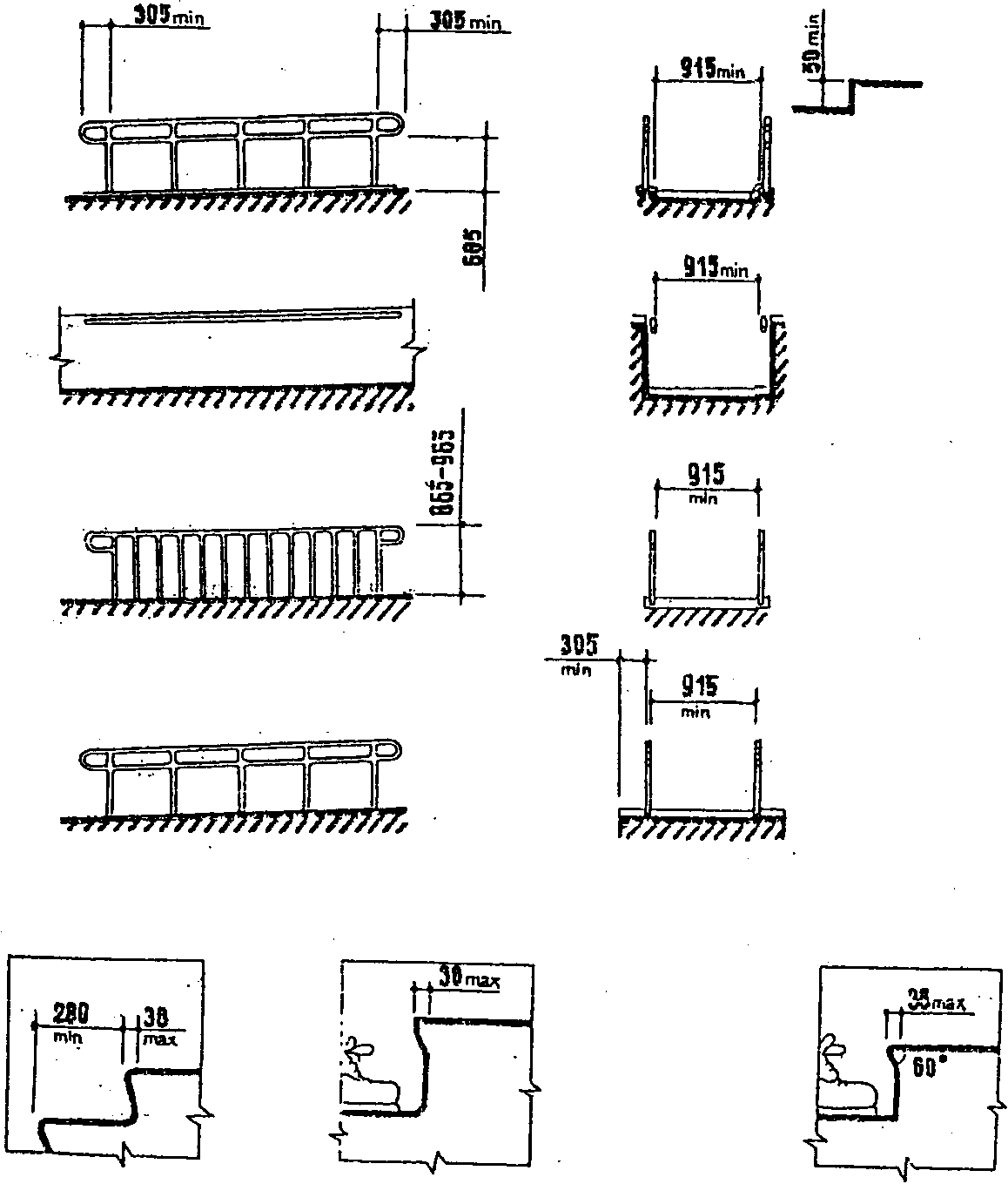 - подступенок в остроугольных ступенях не должен иметь отклонение от вертикали более чем на 38 мм (ступени не должны иметь препятствий для людей, подтягивающих ногу или имеющих протезы, и вследствие этого требующих прочного и гладкого подступенка, направляющего ступню вдоль подъема на следующую ступень);