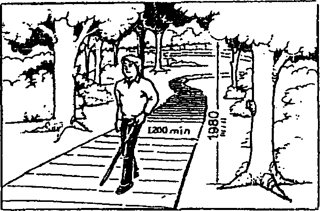 Все пешеходные пути должны быть шириной не менее 1200 мм и через каждые 30 м иметь расширение для обгона. Для свободного движения требуются более широкие пути.