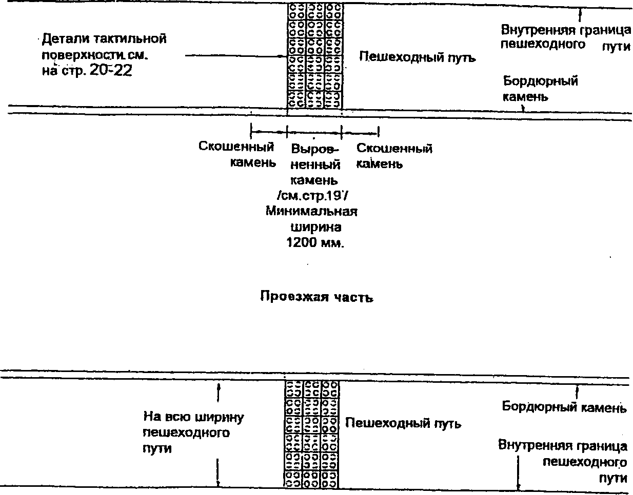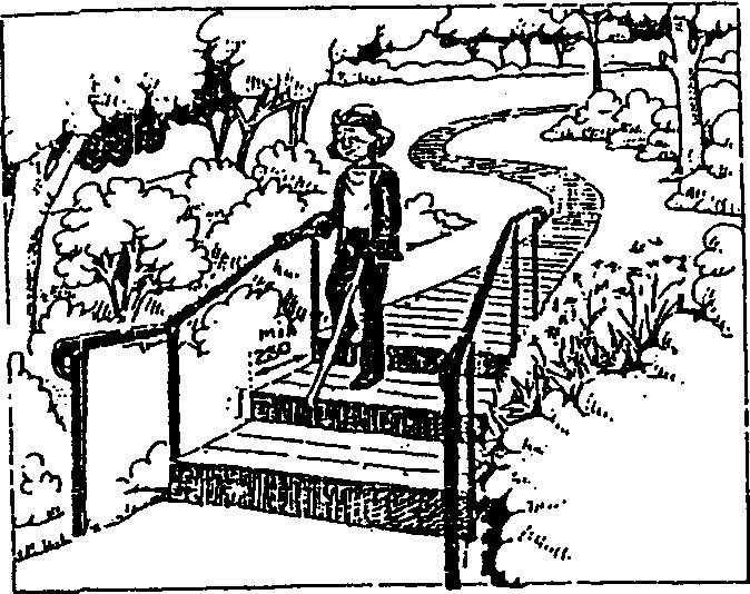 При понижении уровня пути более чем на 75 мм по краям устраиваются бортики. При какой-либо возможной местной опасности (транспорт и др.) пешеходные пути должны оборудоваться поручнями.